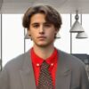 Brown Jacket, red shirt, Red/brown tie
